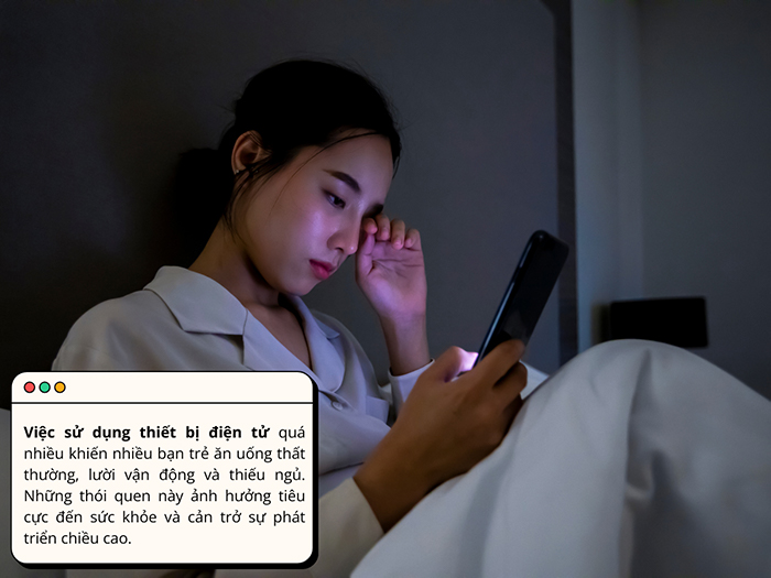Nhiều bạn trẻ do quá tập trung vào thiết bị điện tử mà ăn uống thất thường, không chuyên tâm tập luyện thể thao, thiếu ngủ thường xuyên. Các yếu tố trên gây ảnh hưởng xấu đến sự phát triển chiều cao.