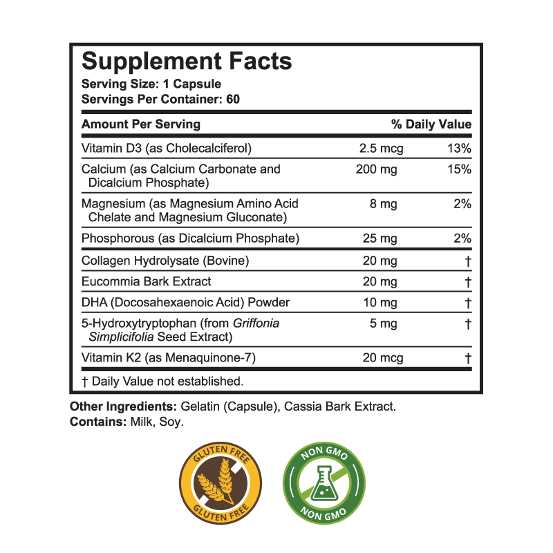 Canxi, Vitamin D3 (Cholecalciferol), Magiê, Phốt pho (Dicalcium Phosphate), Collagen Hydrolysate (từ Bò), Chiết xuất vỏ cây Đỗ trọng (Eucommia Ulmoides), Bột DHA (Axit Docosahexaenoic), 5-Hydroxytryptophan (Chiết xuất hạt mộc lan Griffonia - Griffonia simplicifolia), Vitamin K2 (Menaquinone-7) (MK-7).